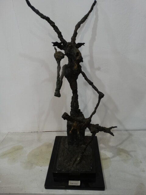Már Tóth Ernő sem a régi. Belátom, ez egy öregedő focista esetében nem túl hízelgő megállapítás. De ha jobban belegondolunk, evidens, hogy ami nem a régi, az új. Erre a tóthernői újra, újdonságra szeretném fölhívni szíves figyelmüket. Jól ismert vidám, csúfondáros, harsogó színekben tobzódó groteszk világára mintha hatott volna a jelen kissé szorongó, szorongató hangulata. Mintha megrendült volna képeinek életigenlő, diadalmas filozófiája: hogy minden lehetséges. Eddig képeit – ha van ilyen – az intenzív határtalanság jellemezte, dúsan tenyésző kertjeinek, terített asztalainak, világot jelentő deszkáinak vagy éppen cirkuszi porondjainak csak a vászon nagysága vagy képkeret – nem a képzelet! – szabott határt. Most már egyes munkáin megjelenik egy szomorúbb, bizonytalanabb életérzés, mely nem mondom, hogy közvetlenül a ránk boruló általános gazdasági, erkölcsi és értékválsággal függ össze, de azt sem állítanám, hogy semmi köze hozzá. Nemrégiben az Erdős Renée Házban a Magyar Művészeti Műhely csoportos kiállításán fölfigyeltem egy szoborcsoportra. Látszólag olyan volt, mint a Tóth Ernő szobrok többsége, piszkafa testek groteszk pózokban, a testfelületek göcsörtösek, melyek izmok is lehetnek, de mondhatjuk azt is, hogy a szobrász kezének és az öntvény akaratának találkozása a boncasztalon – hogy egy klasszikus képzavarral fejezzem ki magam.